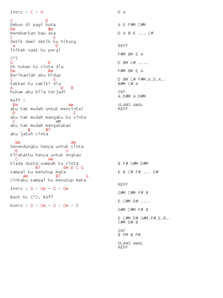 G C hati gelisah selalu. CHORDS USED F C G Am Em D E Dm Fm B7 E7 Fm Intro F C C C G Embun di pagi buta Am Em menebarkan bau basah F C Detik demi detik ku hitung D G F Inikah saat ku pergi verse C G Oh Tuhan ku cinta dia Am Em Berikanlah aku hidup F C Takkan ku sakiti dia D G Sampai Menutup. Cintaku sampai ku menutup mata.